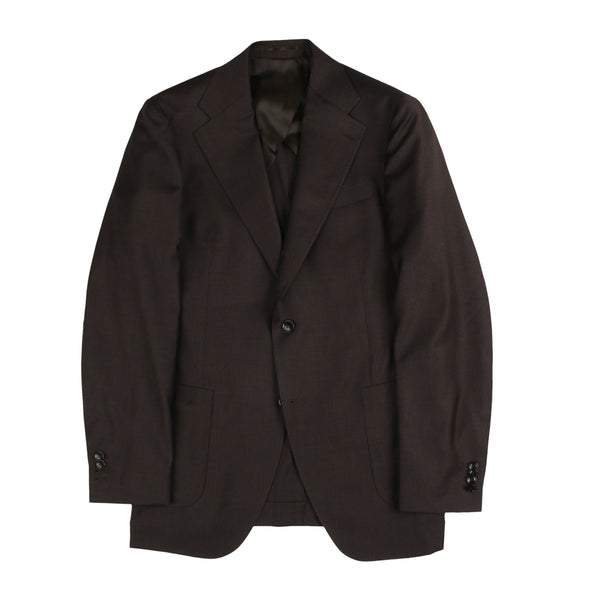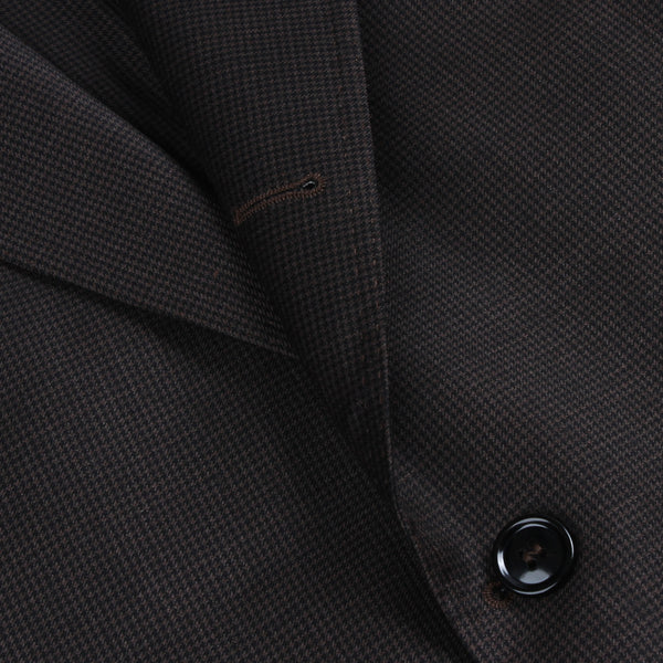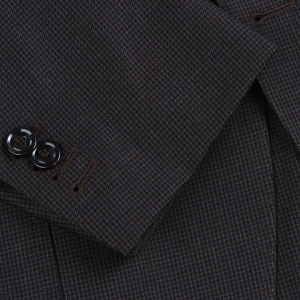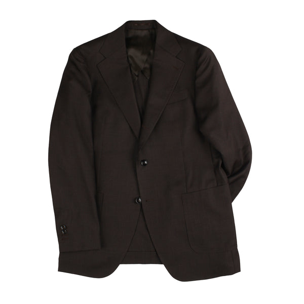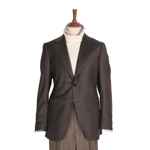 Handmade front and buttonhole, with horn buttons and patch pockets. Made of soft Wool, presents in a sober dark brown herringbone.