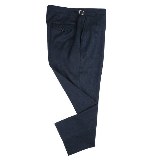 Our trousers are made with a tailored cut and a high waist, designed to be worn at the waist with flat front.