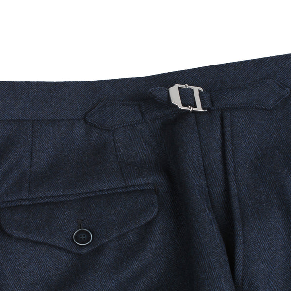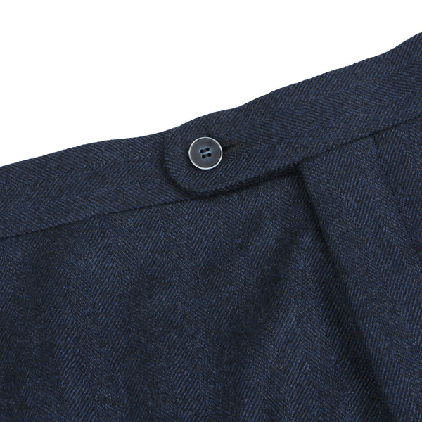 The trousers are cut with space around the thigh and tapered to create a clean line throughout the leg. They are made with horn buttons, side adjusters, two back pockets and an unfinished bottom.