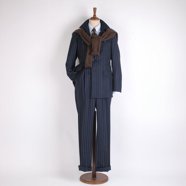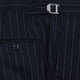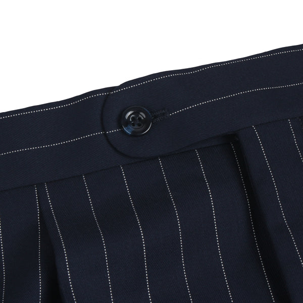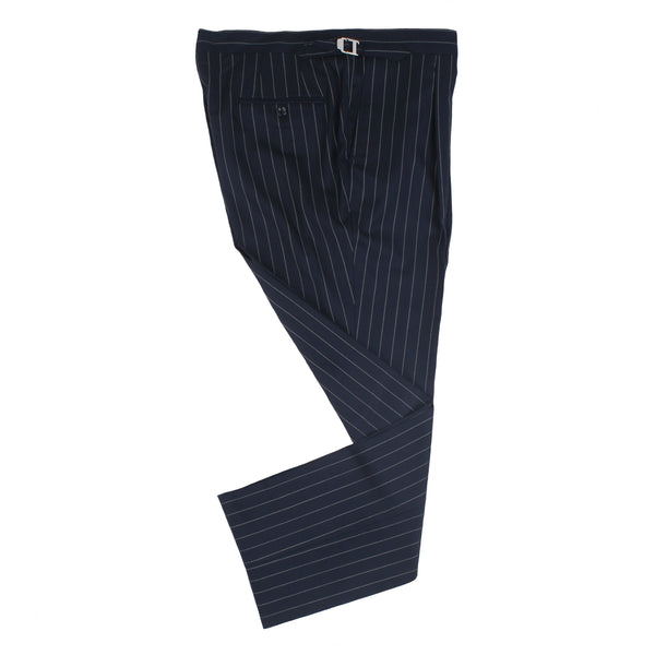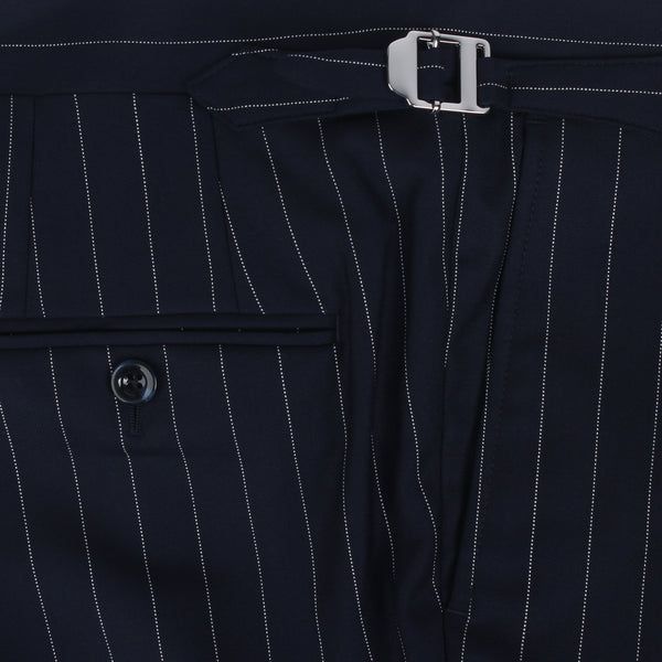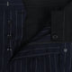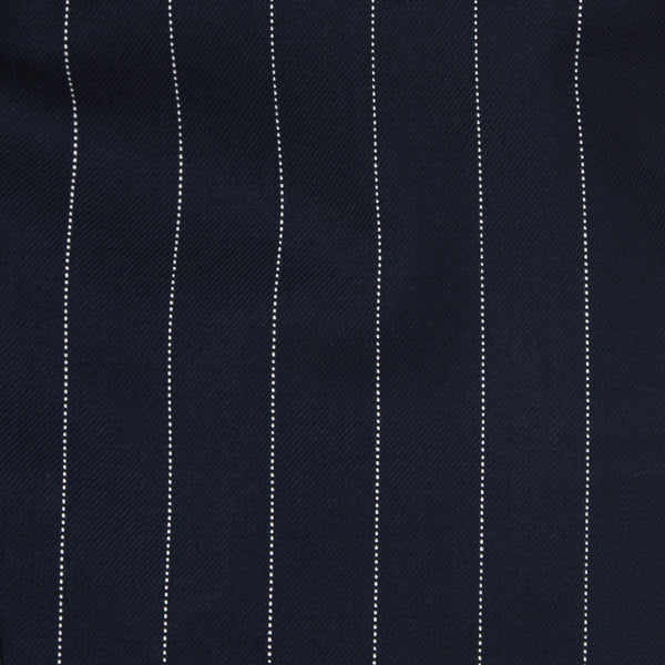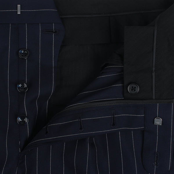 Our suit trousers are made of soft super 140's wool, presented in a navy midnight blue with pinstripe.